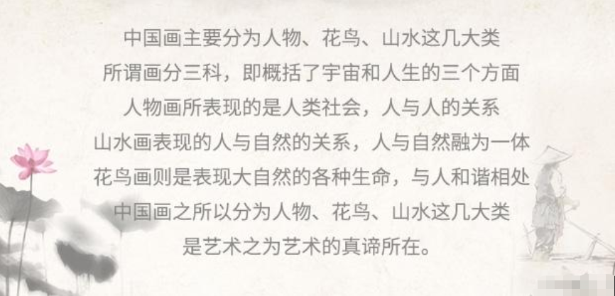 学习内容:水墨画的基础入门及古今水墨画作品欣赏。具体内容:1、通过现代实验水墨游戏,认识水墨画的工具材料,学习水墨画的基本技法;2、通过对传统水墨画如花鸟、山水和人物画的借鉴性临摹,了解富有变化的水墨表现形式,以培养学生对水墨画的兴趣,更让学生有机地学习中国传统文化艺术。