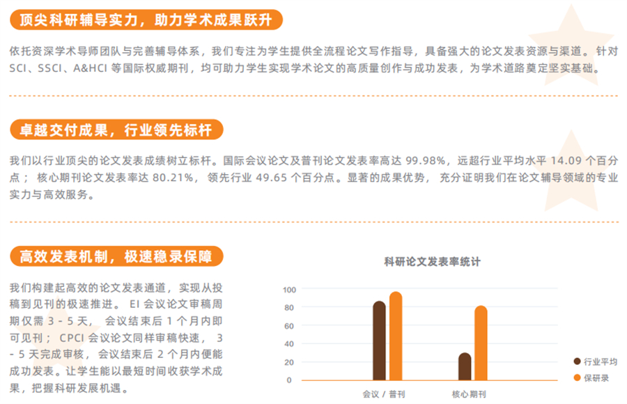 【卓越交付成果,行业领先标杆】:我们以行业顶尖的论文发表成绩树立标杆。国际会议论文及普刊论文发表率高达99.98%,远超行业平均水平14.09个百分点;核心期刊论文发表率达80.21%,领先行业49.65个百分点。显著的成果优势,充分证明我们在论文辅导领域的专业实力与高效服务。
