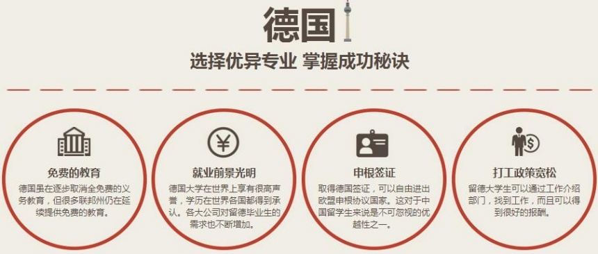 德国教育严谨,机械制造方面德国属于世界顶端,经济学、法学、艺术类学科也同样具有较高水准的教学质量。不论是文科生,还是理科生、艺术生,都可以在这里找到适合的学校。高质量的办学水平带来高就业率,德国高校的毕业生在就业市场里受到认可。再加之中德政治经济上的友好往来,国家也有一些相关政策对留学人才进行扶持,这对于毕业后想要回国发展的同学们是有优势的。