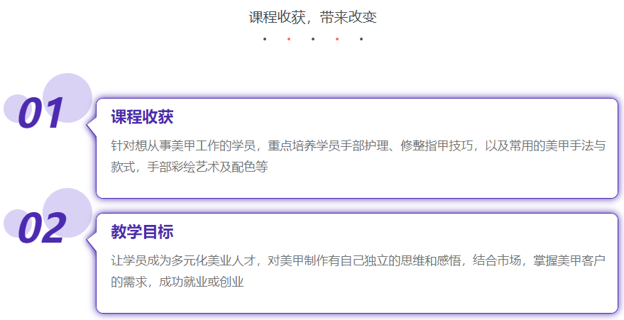 全面性:课程涵盖了美容美发的各个方面,包括基础知识、专业技能、客户服务等,确保学员能够全面掌握所需技能。 实践性:注重实践操作,提供丰富的实践机会,让学员在实践中学习和提升技能。 个性化:根据学员的需求和兴趣,提供个性化的课程设计和教学方案,确保学员能够获得适合自己的培训体验。 前瞻性:关注行业动态和新技术发展,及时更新课程内容,确保学员能够掌握新的美容美发技术和趋势。