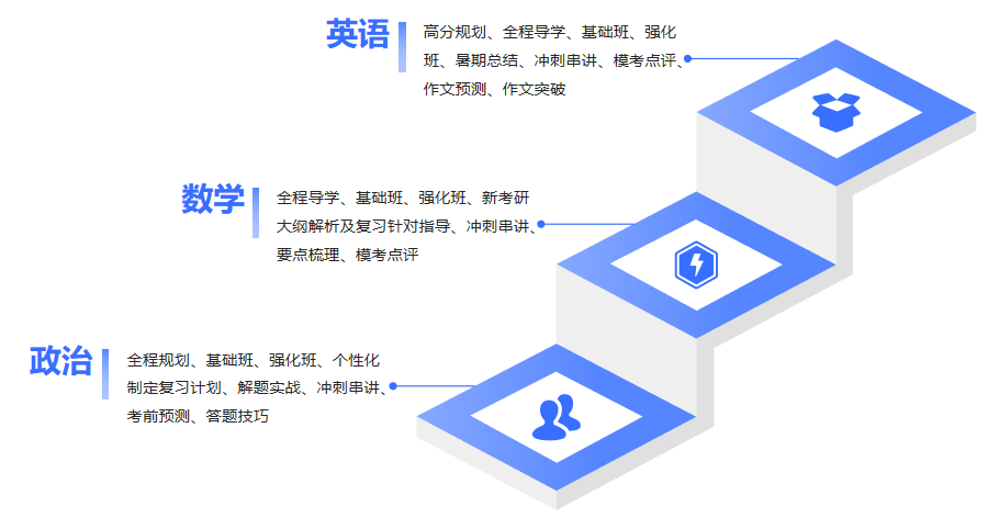 公共课辅导:含政治、英语、数学。政治课解析热点考点、训练答题技巧;英语课提升词汇、语法、阅读、写作等专项;数学课系统讲高数、线代、概率知识点并演练真题。