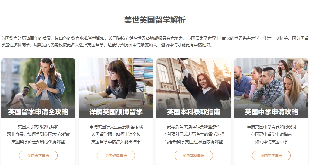 美世教育专门为有意去英国留学的学员开设英国留学申请服务项目,该项目会针对每个学员不同的自身条件进行综合测评,如果你还在为择校择专业举棋不定,留学顾问会帮助你挑选几个适合你的学校和专业,再根据学员的意向进行进一步的选择。对于所需留学资料,老师也会积极帮助你整理齐全,并在准备过程中做全方位的留学指导,让学员顺利留学。