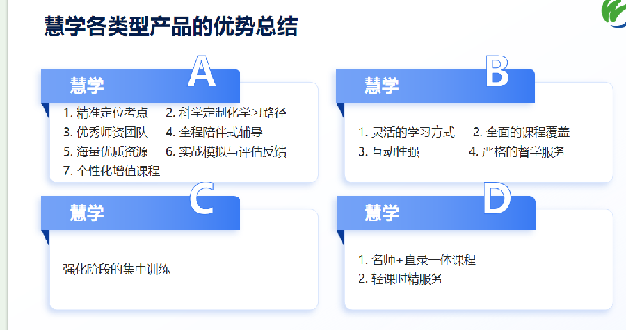 文都考研慧学计划结合不同阶段、基础考研学子的学习需求与学习特点,推出有多个系列的考研辅导课程,课程将不同基础的学员进行分层教学,旨在循序渐进的培养考研学子的学习进度。整个慧学走读班课程中,助教老师团队贯穿课前到课后,为考研学子输送丰富的学习资源、分析学习问题、传达最新考研政策与动态。