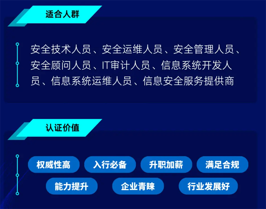 满足和企业对于信息安全认证的特定要求,拥有该认证人员的企业有利于提升企业竞争力,为公司申请相关能提供有力支撑。