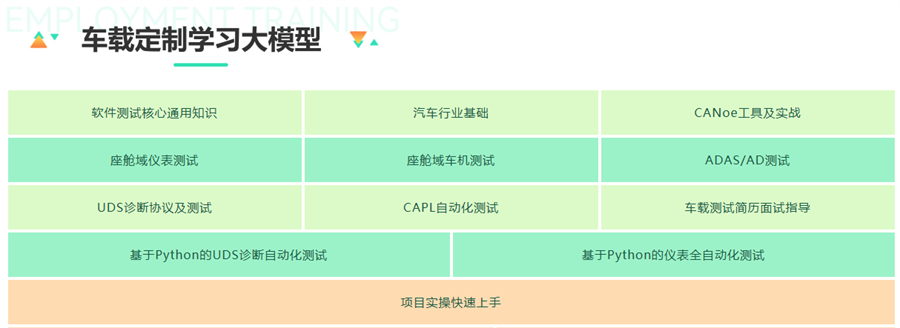 一、适合学员 0经验小白:寻求有发展前景的工作,对软测试或车载领域感兴趣,从0到1快速进入测试行业,掌握实用技术 想寻求转行:对目前工作、薪资不满意,想快速转行寻求新出路,课程直击企业核心内容,提升综合职场技能 为职场充电:进入瓶颈期,想升职加薪,拓展技术栈,掌握硬技能,助力未来职场走得更远 二、课程内容 1、车载系统概论:车载硬件架构:传感器、控制单元、执行器;车载软件架构:操作系统、应用层、通信协议;车载网络技术:CAN、LIN、MOST、以太网 2、车载测试基础:测试基本原则与流程;测试类型:功能性测试、性能测试、稳定性测试;测试级别:单元测试、集成测试、系统测试、验收测试 3、测试设计:测试计划的制定;测试用例的设计原则与方法;仿真测试环境搭建;测试自动化及工具应用 4、测试执行与管理:测试执行流程;缺陷管理流程;测试团队协作与沟通;风险评估与控制 5、车载系统安全性测试:安全性测试的重要性;安全标准与合规性测试;攻击模式与防范措施 6、车载系统性能测试:性能测试指标;负载测试、压力测试、稳定性测试方法;性能瓶颈分析与调优 7、车载系统测试工具与环境搭建:测试工具概述:仿真工具、自动化工具、性能测试工具;环境搭建:模拟车辆动态行为、搭建通信环境 8、实车测试与问题定位:实车测试流程与准备;数据记录与分析方法;现场问题定位与解决 9、行业标准与法规:国际标准:ISO26262、AUTOSAR、IEEE等;地区法规与合规性要求 10、测试项目管理:项目规划与估算;进度管理与跟踪;质量控制与改进