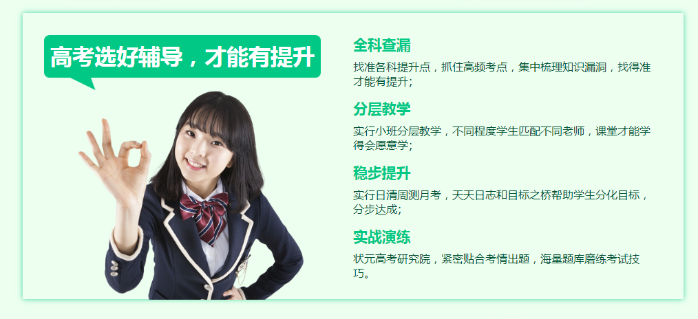 漏洞难题:难以精准定位学科知识中的薄弱环节,复习时如同无头苍蝇般盲目,导致学习效果不佳,成绩提升陷入瓶颈。 方法困境:缺少科学有效的学习方法,所学知识杂乱无章,难以在脑海中形成系统的知识体系,记忆困难且做题时频繁出错。 规划困境:冲刺阶段的学习与普通阶段大不相同,单纯地埋头苦学往往事倍功半,缺乏合理规划的复习容易陷入混乱,效率低下。 状态困境:备考过程中承受着巨大的心理压力,精神状态不佳,要么容易陷入自我放弃的消极情绪,要么盲目乐观而忽视自身问题。 师资困境:想要实现成绩的显著提升,优秀老师的指导至关重要。老师授课应紧密结合学生的实际情况,做到举一反三,帮助学生更好地理解和掌握知识。 全科查漏补缺:精准定位各学科的提升关键点,聚焦高频考点,对知识漏洞进行集中梳理。只有找准问题所在,才能有的放矢,实现成绩的有效提升。 分层因材施教:采用小班分层教学模式,根据学生的学习程度为其匹配最适合的老师。这样能确保课堂内容符合学生的接受能力,让学生学得轻松、愿意学。 稳步进阶提升:实施日清周测月考的制度,通过天天日志和目标之桥等方式,帮助学生将大目标分解为一个个小目标,分步骤逐步达成,实现稳步提升。 实战模拟演练:依托状元高考研究院,紧密围绕考试实际情况进行命题,借助海量题库让学生反复练习,磨炼考试技巧,增强应试能力。 高效课堂打造:在教学过程中,如何充分利用课堂40分钟,提高教学效率,是突破课堂教学效果的关键所在。 “两个对待”原则:要求学生上课前做好新知识的预习工作,课堂上积极参与互动,充分调动学习的主动性和积极性。 “四精”教学要求:教学内容精心筛选、讲解精准到位、练习精挑细选、评价精细入微,确保学生学有所获。 “五必”作业规范:作业发放后必定收回,收回后必定查看,查看后必定批改,批改后必定讲评,讲评后必定补充完善,形成完整的学习闭环。学习困境