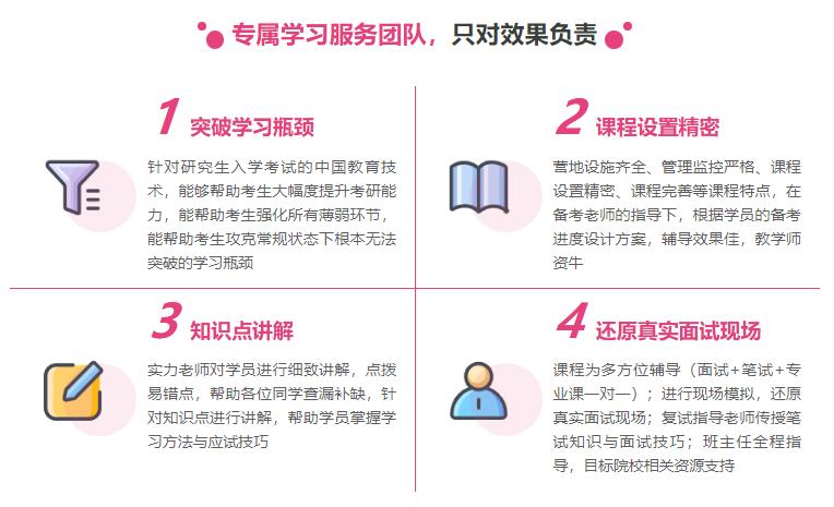 提供涵盖备考规划、初试备考、复试指导等全流程的服务,安排专属学习顾问,全程跟进学习进展,及时处理学习难题和心理困扰;搭建学习交流社群,方便考生之间、考生与老师随时互动交流。