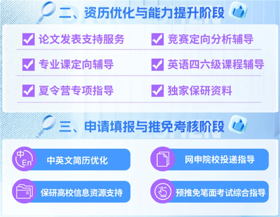 保研边缘生:这类学生专业排名通常在10%-15%,处于保研录取的临界状态,需同时筹备保研和考研以防失利。机构会提供“保研+考研”双线辅导,提前预警院校缩招等风险,若保研失败可无缝衔接考研课程,降低“失学”风险。
