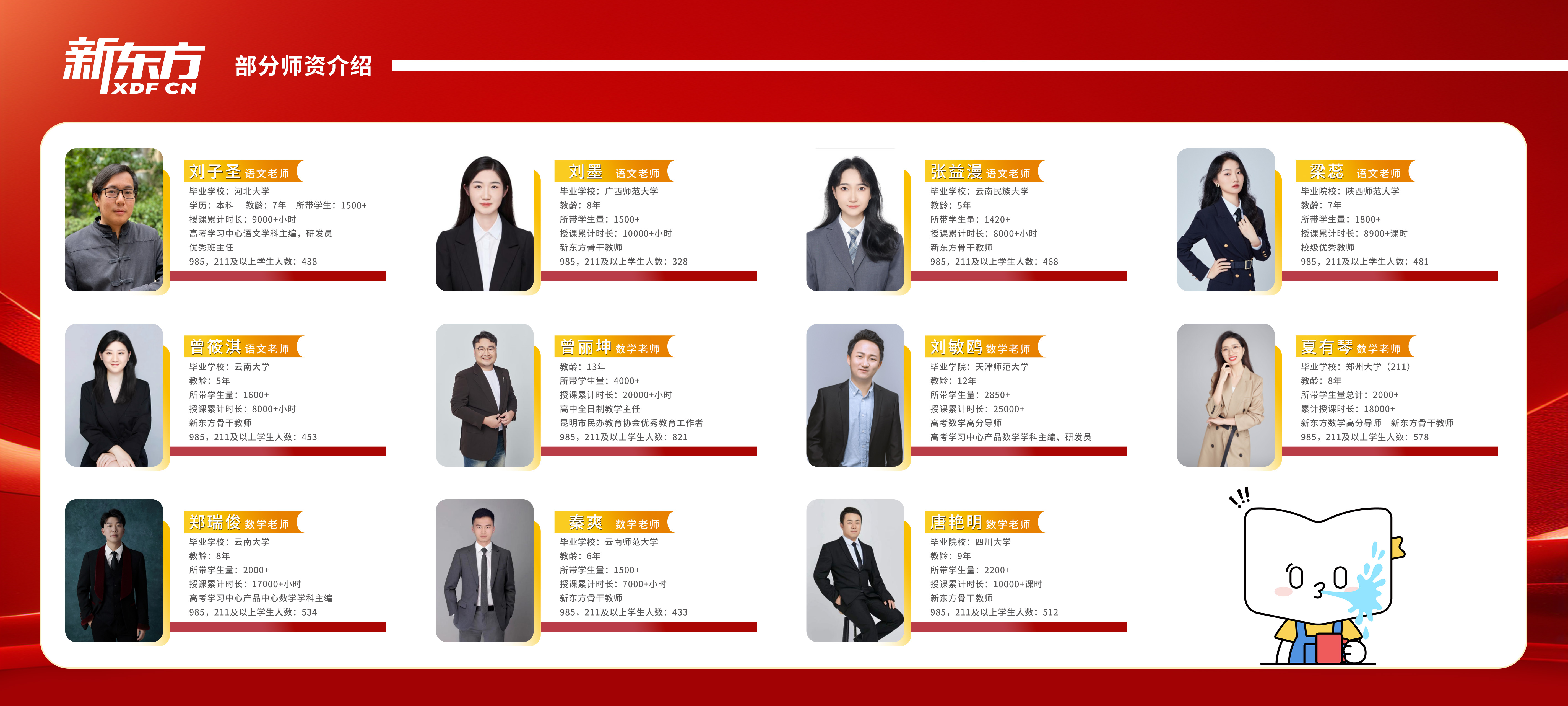 【优势一】:核心教研团队——教师团队是云南新东方带课教授时间(共超过5w小时)最长,教授学员(共超过5w学员)最多的一批高考老师组成。每位老师都会驻扎在基地,针对全日制学员做针对性的授课以及晚自习同步辅导和课后及时答疑。